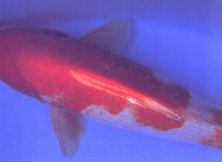 白点病は、錦鯉に限らず、魚を飼育したことのある者なら一度は目にする最もポピュラーな魚病である。白点病は、発病すると進行が早く、伝染性も高く、最も警戒を要する病気の一つでもある。水温25℃以下で一年中発生し、特に水温が変わりやすい春先や、梅雨時、秋口には発病しやすい。また、移動などで急激に水温や水質が変わると発病する場合が多い。白点病は早期発見が第一で、初期のうちに治療をすると、すぐに白点がとれて健康体に戻る。