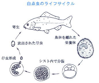 - 白点虫は、表皮下に寄生しているために直接の駆除は困難で、魚から離れたものを駆除することになる。このため、白点虫がどのようなライフサイクルを持つかを知れば、駆虫を効果的に行うことができる。