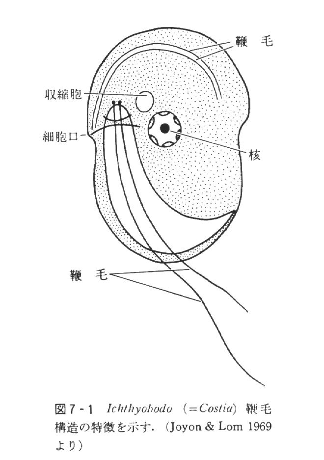 - イクチオボドは、キロドネラやトリコジナなどと混合寄生することが多く、外観上の症状も似ているので区別しにくく、正確には顕微鏡で虫体の確認をする。
