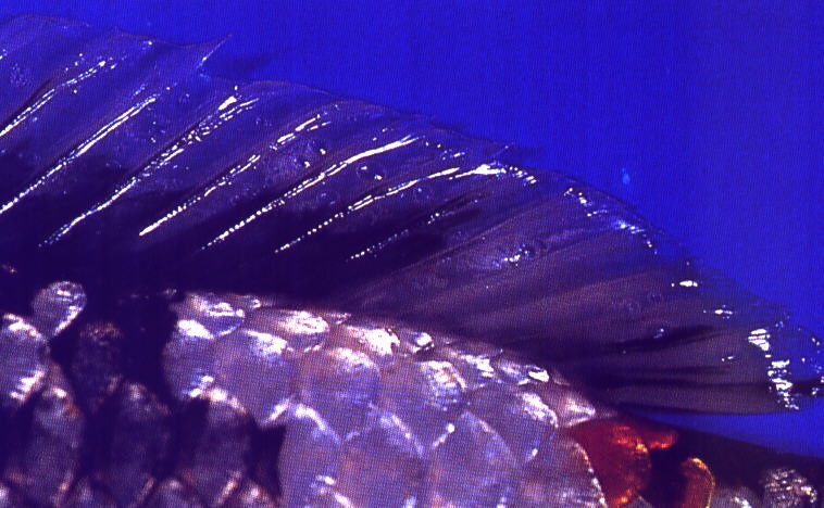 - 各鰭の血管に小さな泡粒状の気泡が生じ、眼の周囲、頭部にも気泡が発生する。眼球が突出する場合もあり、症状が進めば血行障害を起こし、キリキリ舞いの狂奔状態を呈して死亡する。軽症の場合には気泡が各鰭の血管などに生じないこともある。